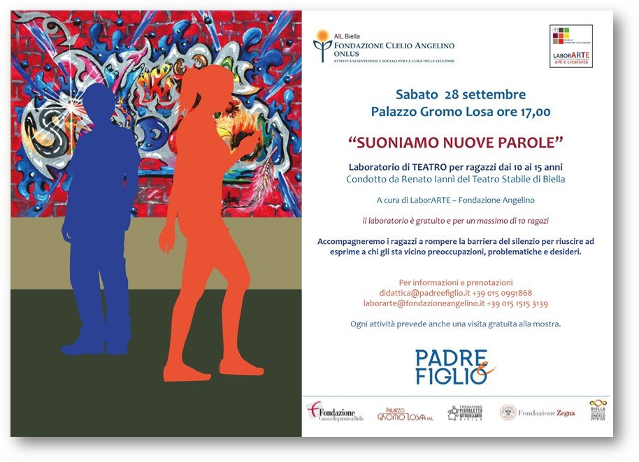 Sabato 28 settembre 2019, nel tardo pomeriggio, è proseguito l’appuntamento con i laboratori di LaborARTE dedicati a “Padre & Figlio” presso il Palazzo Gromo Losa in corso del Piazzo, 24 a Biella: “SUONIAMO NUOVE PAROLE” con la conduzione di Renato Iannì del Teatro Stabile di Biella.