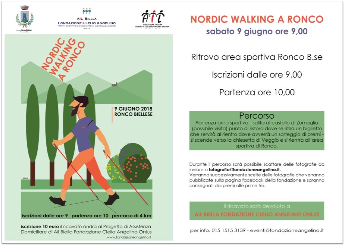 La locandina dell'evento benefico "NORDIC WALKING A RONCO" di sabato 9 giugno 2018, trasmessa dal Responsabile Comunicazione ed Eventi dell'AIL Biella Fondazione Angelino