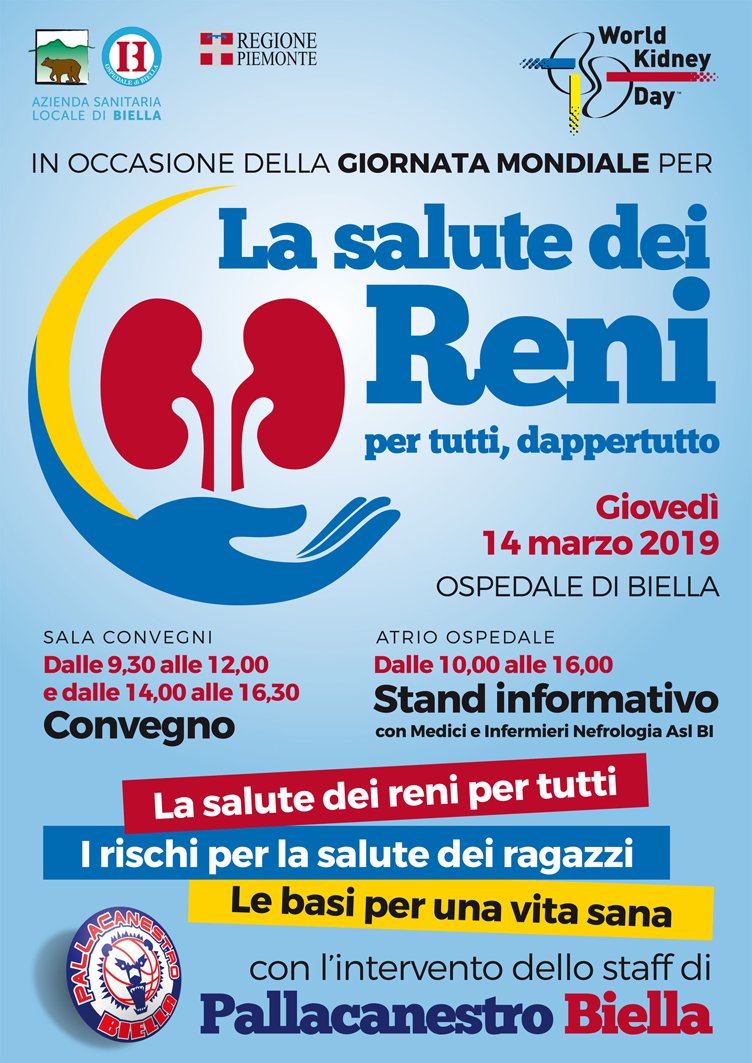 Giovedì 14 marzo in occasione della Giornata Mondiale del Rene 2019, che ha avuto come tema “La salute dei Reni per tutti, dappertutto” ed è stata promossa in Italia dalla Società Italiana di Nefrologia (SIN) e dalla Fondazione Italiana del Rene (FIR Onlus), la Struttura Complessa (SC) Nefrologia e Dialisi dell’ASL BI, diretta dal dottor Ilario Mauro Berto, ha organizzato tre iniziative per cittadini, studenti, Associazioni di pazienti e professionisti dedicate alla Prevenzione e alla salute dei reni: