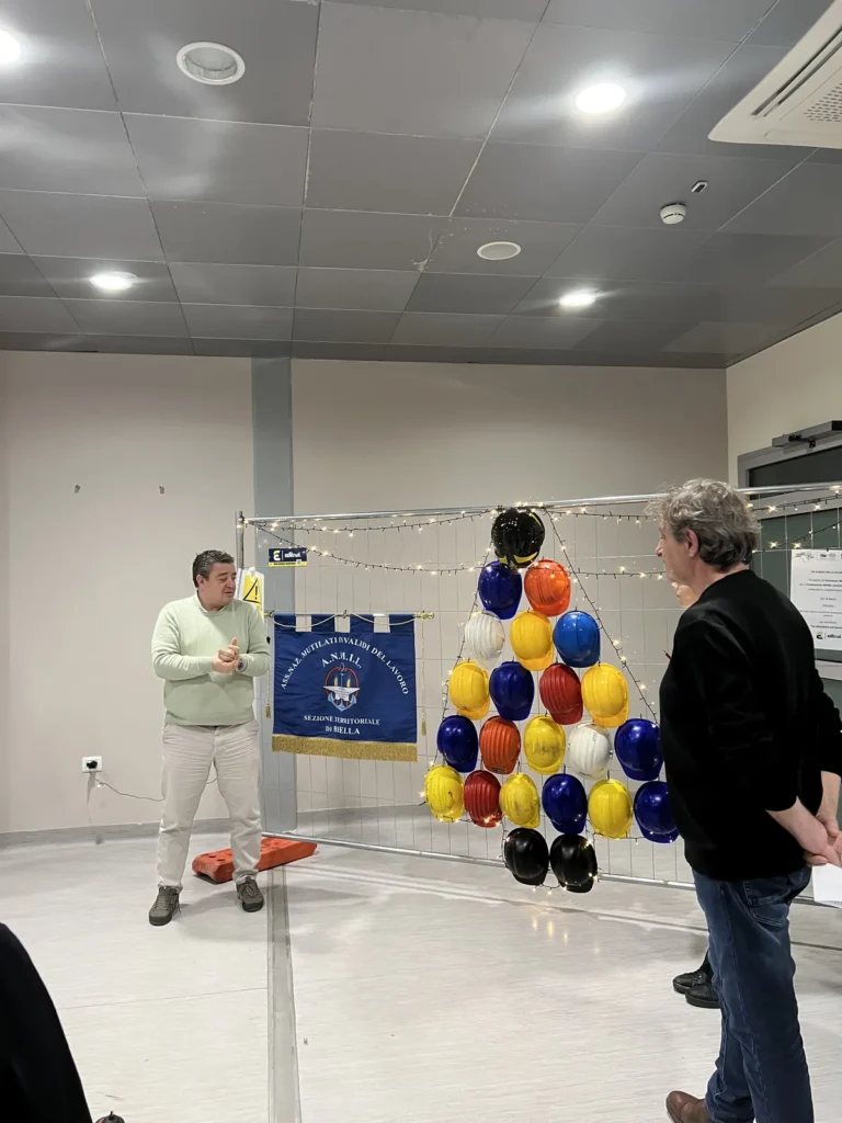 • Dottoressa Sara Crestani di ANMIL sez. Biella ha dato il benvenuto e ha ringraziato i presenti, dando inizio alla scopertura albero. Ha inoltre illustrato il progetto spiegando il significato dei colori dei caschetti:
