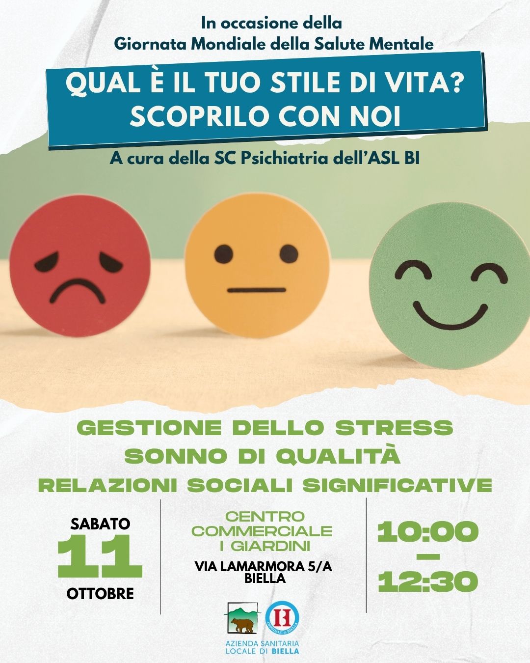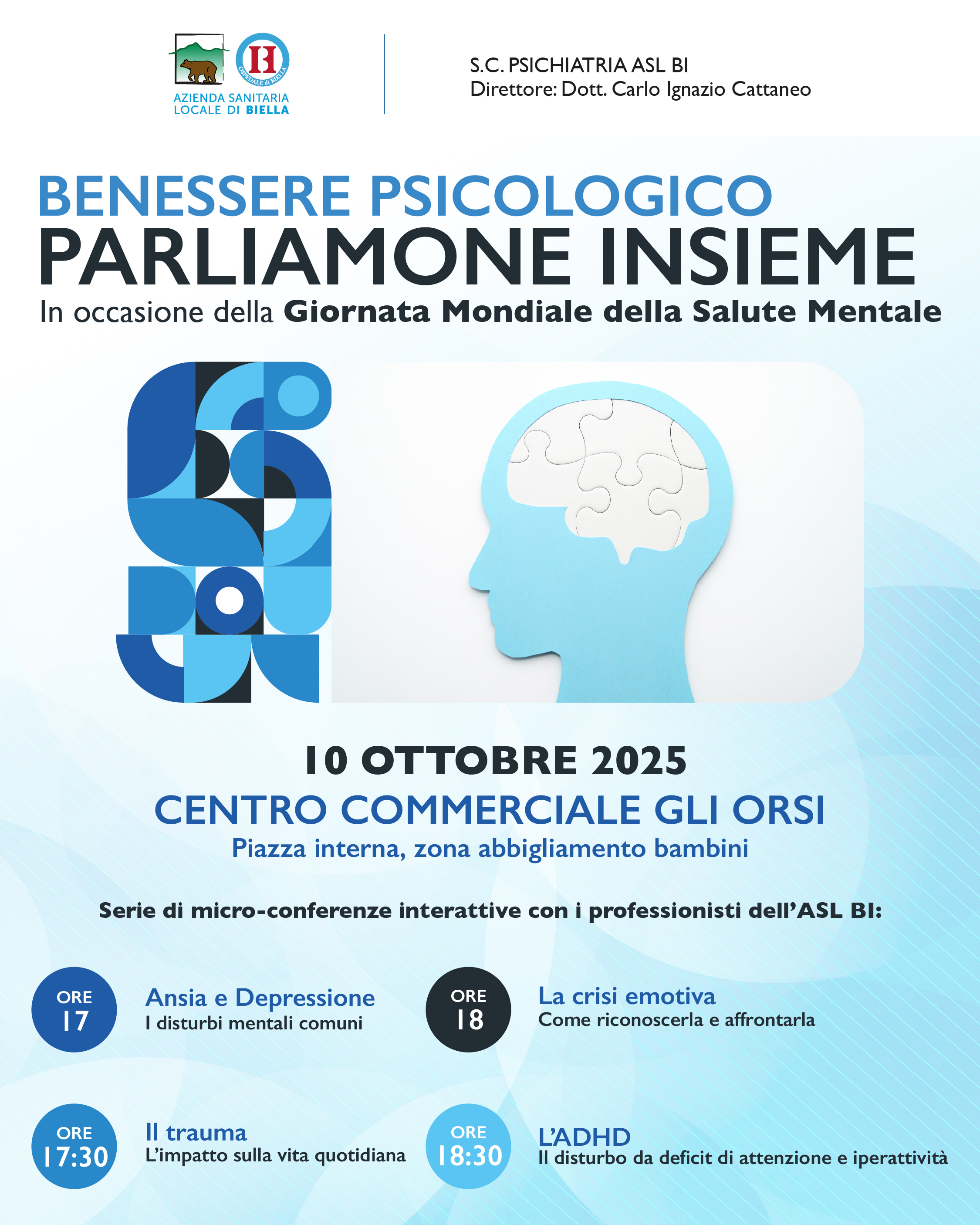 Il 10 ottobre ricorre la Giornata Mondiale della Salute Mentale e lo Staff della Struttura Complessa Psichiatria dell’ASL di Biella, diretta dal dottor Carlo Ignazio Cattaneo, ha organizzato due iniziative rivolte alla cittadinanza nelle giornate di venerdì 10 e sabato 11 ottobre 2025 rispettivamente presso il Centro Commerciale “Gli Orsi” e presso il Centro Commerciale “I Giardini” di Biella.